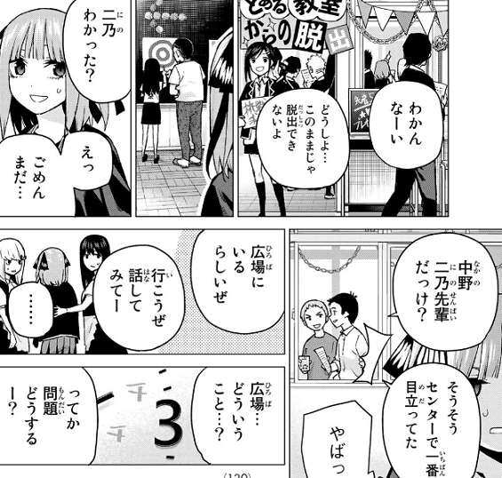 二乃は友達と脱出ゲームに挑戦しているようですが、オープニングダンスのセンターで一番目立っていたと、話題になっていて何故か広場にいると噂になっています。広場にいるという噂が気になるようですが、約束の15時まであと少しです。