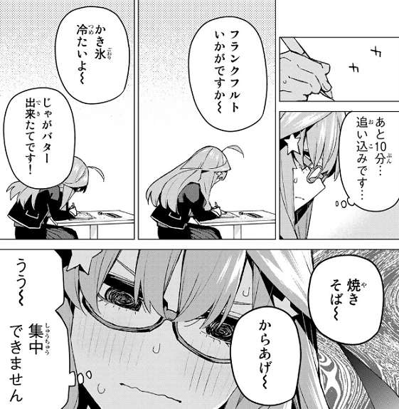 約束の15時まであと10分、五月は勉強を最後まで頑張ろうとしますが食べ物の誘惑に勉強に集中できないようです。風太郎もおじさんの道案内を終えて、椅子を運んでいますが忙しすぎて限界のようです。