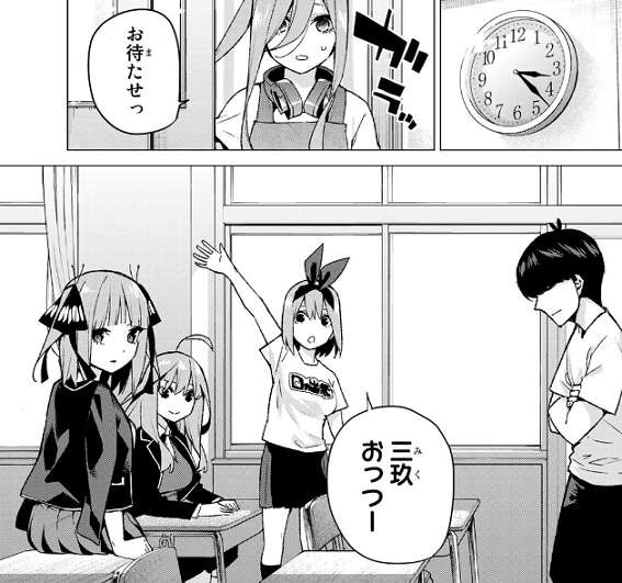 三玖はパンケーキが完売したタイミングで屋台をぬけて、教室に走って向かいます。結局20分以上遅刻してしまいましたが、教室には一花を除く全員が集まっています。