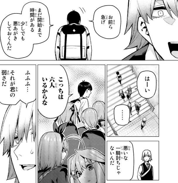風太郎は武田から五つ子たちの家庭教師を代わってあげようかと提案されます。五つ子たちの父親と知り合いで事情を知っていて、風太郎がバイトを掛け持ちしている事も知っているようです。風太郎は決めるのは五つ子たちだと言いますが、武田から五つ子たちが風太郎を手放さないと確信しているんだねと突っ込まれます。一方、勉強会を再開させた風太郎と五つ子たちですが、五つ子たちの模擬試験の結果は散々です。