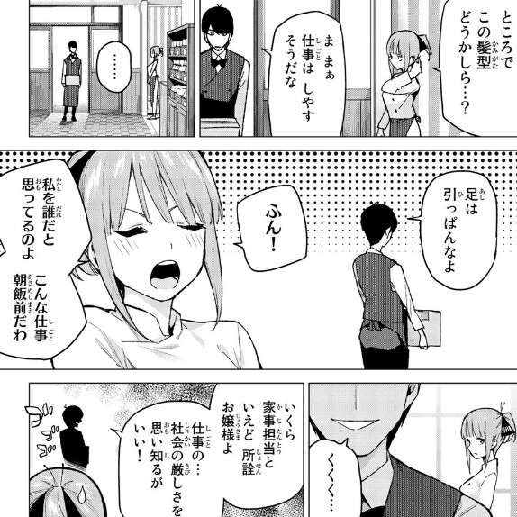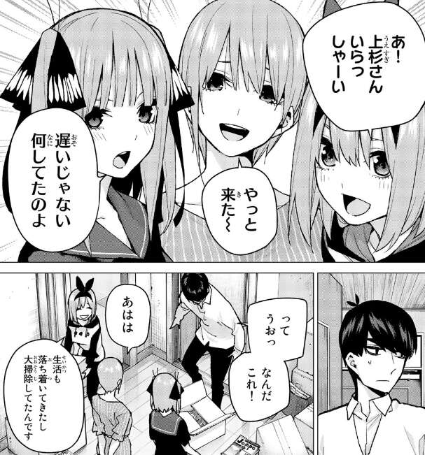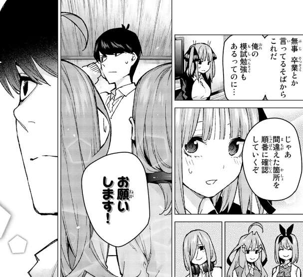 全国統一模試で、風太郎は見事全国三位と条件の全国十位以内をクリアし、五つ子たちの父親からも正式に家庭教師の仕事を再度頼みたいと直接お願いされます。風太郎は家庭教師を快諾した後、さらに五つ子たちの父親に次の道を見つけてこその卒業、五つ子たちの夢を見つけてやりたいと宣言します。父親からはどんな方針でも結構だが、あくまで家庭教師、娘たちには紳士的に接してくれると信じている、とおかしな事にならないよう釘を刺されます。が、五つ子たちから熱烈な歓迎を受け、早くも不安になります。