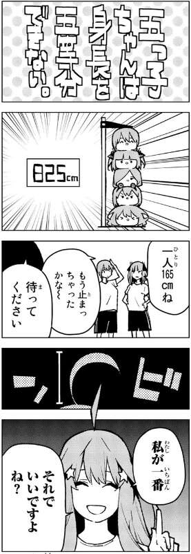 五つ子たちの身長は、五人で825cm、二乃は一人165cmね、と言いますが五月はアホ毛の部分を主張しだして…。
