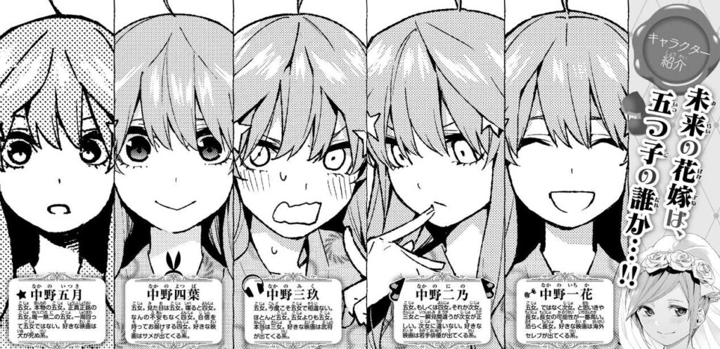 今回のキャラクター紹介では、五つ子たちの映画等が書かれています。キャラクター紹介の五女ネタは、多分温泉旅行で四人全員が五月に変装していた話に由来しているのだと思います。