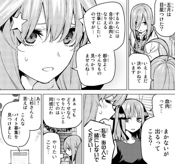 4月になり五つ子たちも来週から、新・三年生となりみんなで頑張ろうっという話になりますが、一花からは家賃を五等分にすると突然言われます。払えなかった人は、前のマンションに強制退去となってしまい、最悪父親と二人きりになってしまいます。お金を稼ぐべく、二乃達は色々な仕事の求人票を見ながらアルバイト先を探し始めます。