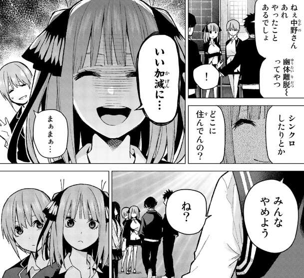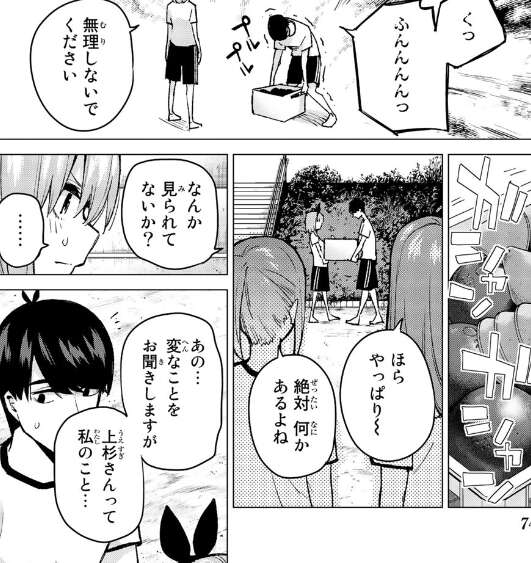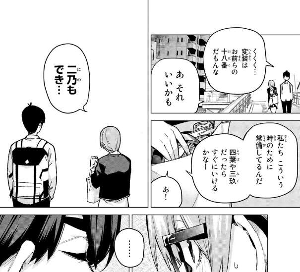 先週のバイトで二乃が聞くはずだった風太郎の誕生日での欲しいものですが、バイト先では他の事で頭がいっぱいでまだ聞けていません。風太郎本人に欲しいものを聞くのも違うと思っていると、四葉がクラスのみんなに聞いて回ります。しかし誰も風太郎の好みなど知らず四葉が苦労していると、クラスメイトの女子から風太郎と四葉が付き合っているという噂を聞き、四葉は恐れ多いとびっくりします。
