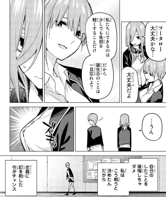 風太郎と五つ子たちは新・三年生になり、新しいクラスにも少しずつ馴染んで高校生活最後の一年を過ごしていきます。全国実力模試で風太郎たちの実力を試されますが、無事全国実力模試、三位という成績も収めて問題ないように見えますが…。