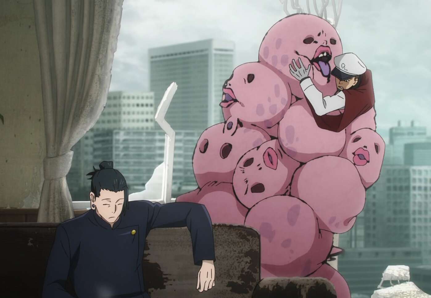 音楽室へと向かっていた使用人の黒井はもう一人の呪詛師を見つけて、そのまま呪詛師を倒してしまいます。しかし、倒した呪詛師はその場で消滅してしまい、五条の方に同じ背格好の呪詛師がさらに五人現れます。