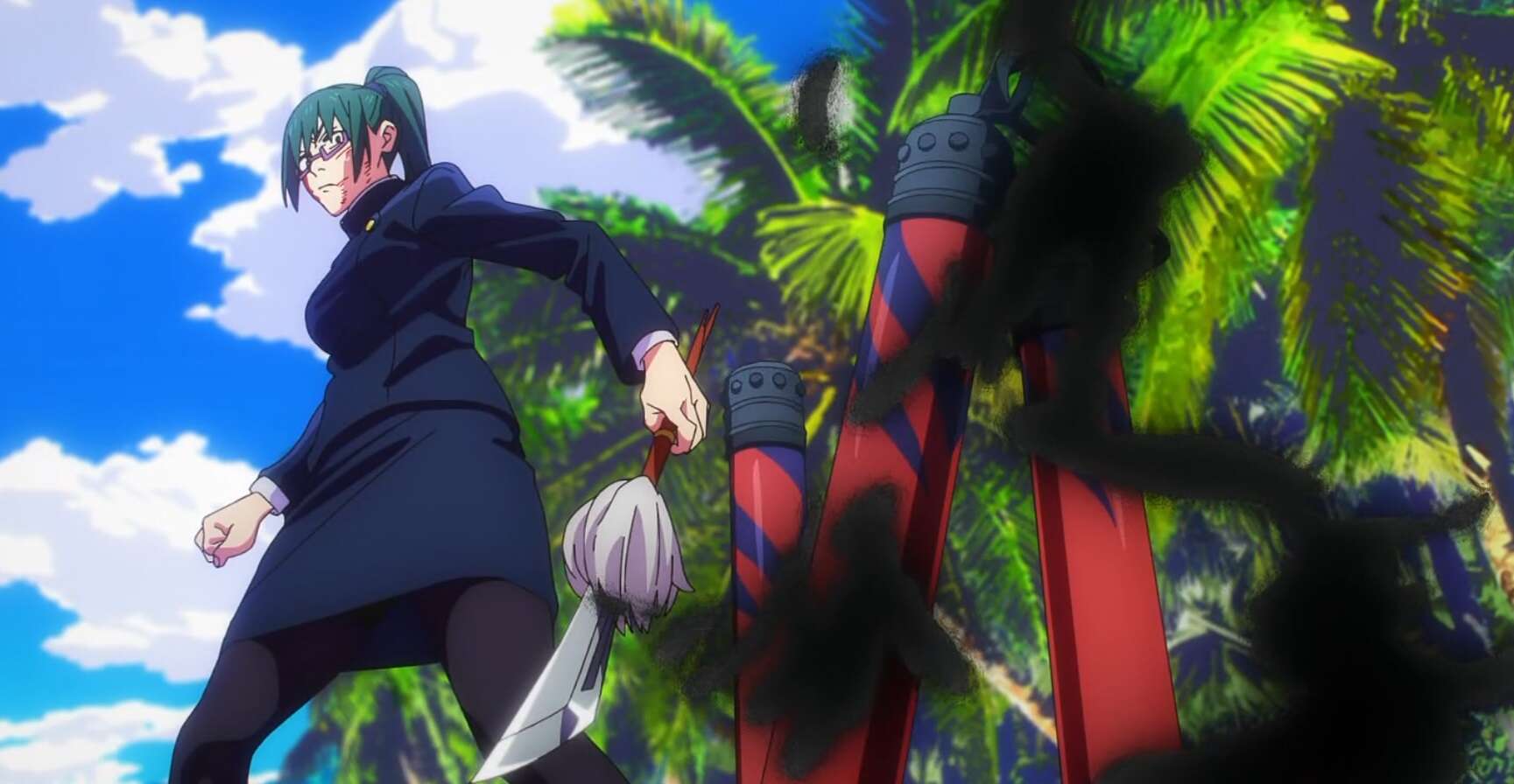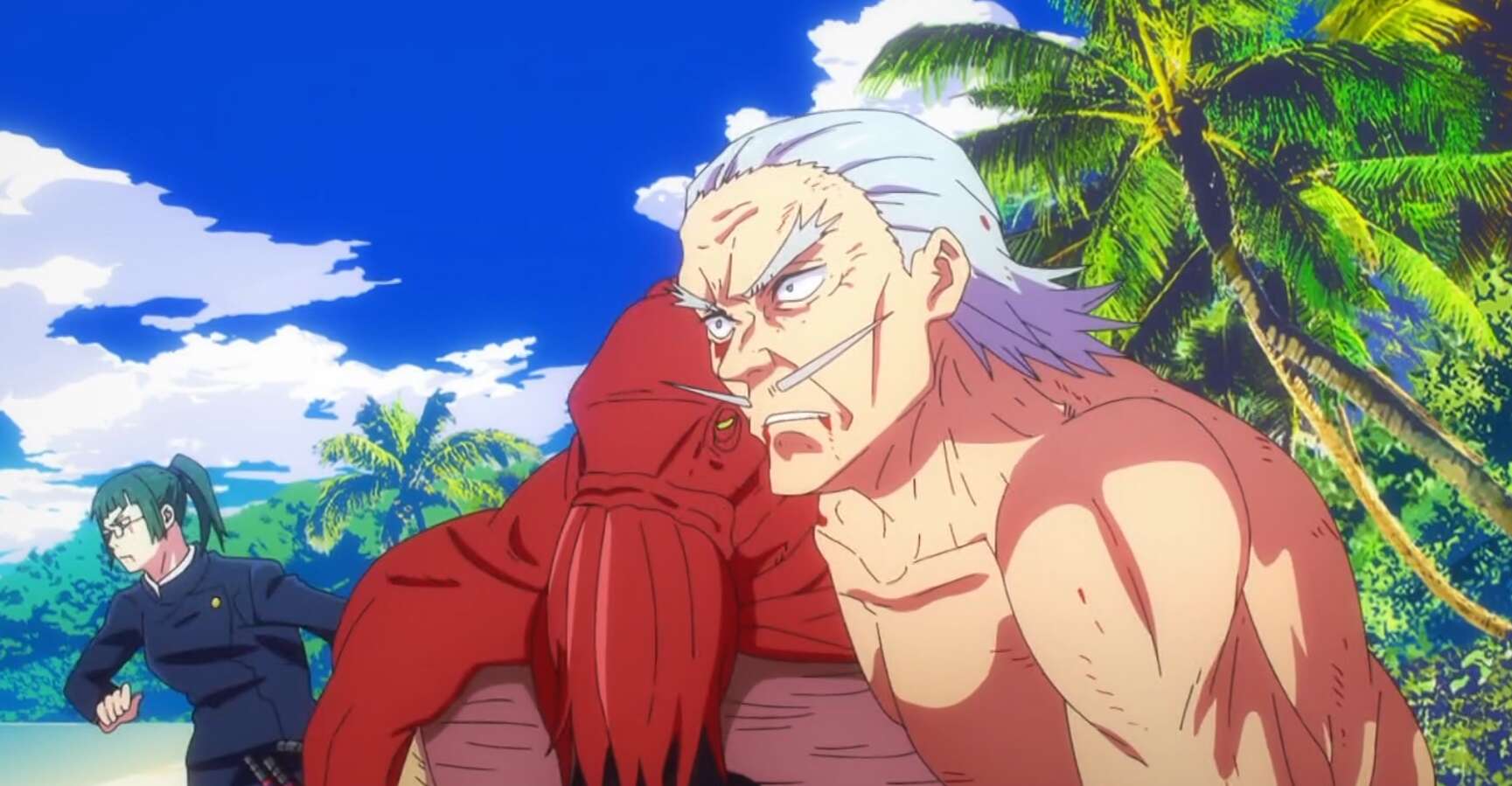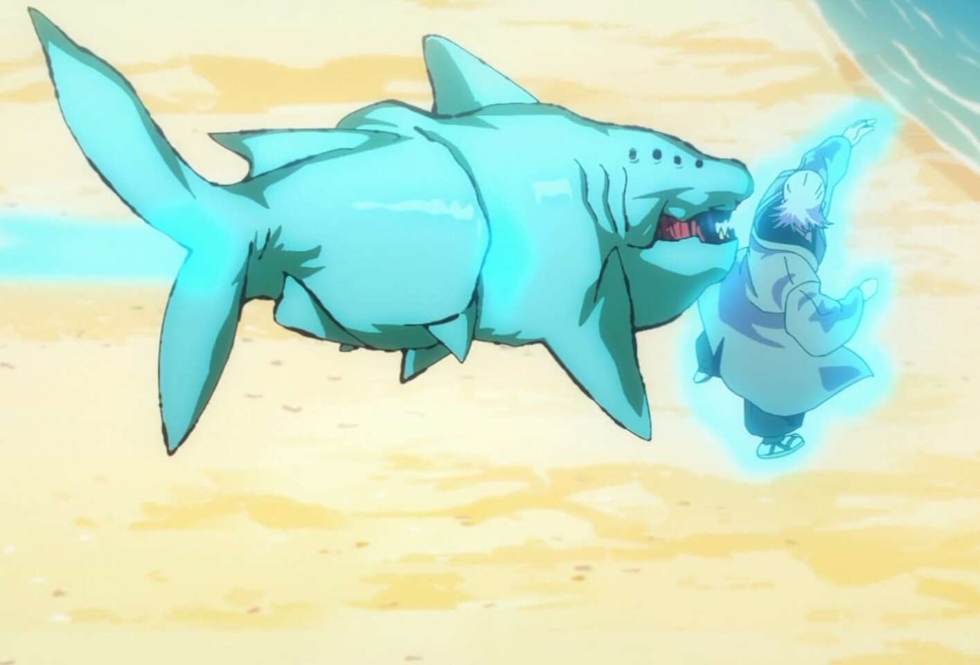 陀艮が領域「蕩蘊平線(たううんへいせん)」を展開すると、ビーチのような風景が広がり魚の式神が直毘人、七海、真希を襲います。七海と真希は魚の式神の攻撃をくらってしまいますが、直毘人は秘伝「落下の情」で魚の式神を倒します。