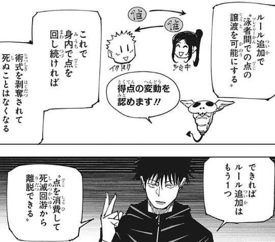 伏黒は“プレイヤー間でのポイントの譲渡を可能にする”というルールを追加する事で、身内でポイントを回し続ければ、術式を剥奪されて死ぬことはなくなる、と考えます。これで津美紀は殺し合いに参加しなくてもよくなります。さらに伏黒は、出来ればルール追加はもう1つ、“ポイントを消費して死滅回游から離脱できる”というルールを追加したいと考えます。それは例の“永続”に抵触するんじゃねぇか?と、秤は指摘しますが、伏黒も同じ考えのようです。それでも、非プレイヤーを死滅回游に引き込む身代わり条件をルールに盛り込めば、ルール追加出来るのでは?と、伏黒は考えます。