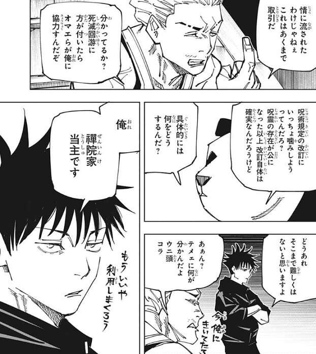 話は死滅回游の事へと戻り、秤は死滅回游の平定には協力すると虎杖達に約束します。しかし、これは情に流されたわけでなくあくまで取引で、死滅回游に方が付いたら今度は虎杖達が秤に協力するように念を押します。秤は呪術規定の改定に口を出して、秤達がやっている賭け試合に有利になるようにしたいのだと思います。伏黒は秤にそこまで難しくないと思う、と言い、自分が禪院家当主だと明かします。伏黒はもう禪院家当主を断ることを諦め、禪院家当主の地位を利用しまくろうと考えます。