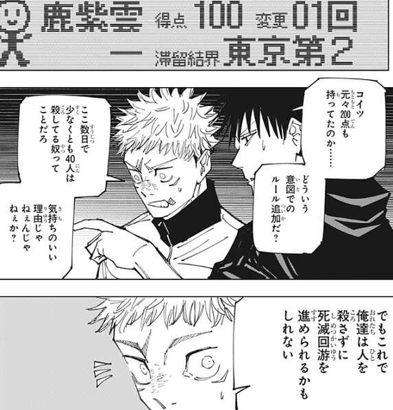 この話は後回しにして、伏黒は虎杖に憑いているコガネにプレイヤーの情報を出すように言います。コガネが出した情報を見て、虎杖達は総則9を追加したのは鹿紫雲一だと知ります。元々200ポイントを持っていたので、ここ数日で少なくとも40人以上は殺している事になり、ルールを追加したのは気持ちのいい理由ではないのでは、と虎杖は推測します。しかし、これで俺達は人を殺さずに死滅回游を進められるかもしれない、と伏黒は言うと、得点が100ポイント以上のプレイヤーだけをリストアップするようにコガネに言います。