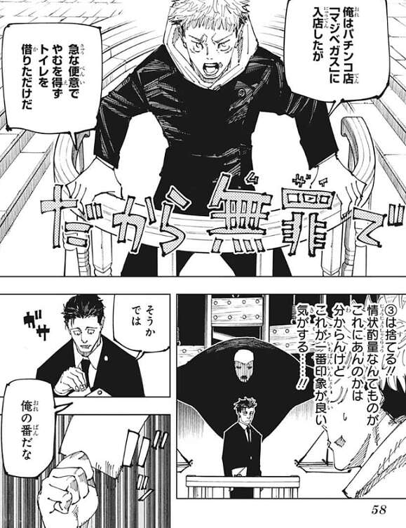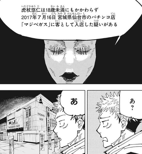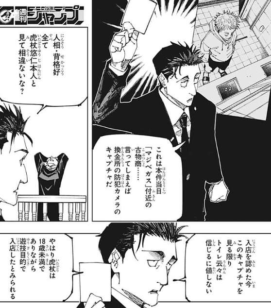 日車の番となり日車は証拠の中身を出しますが、それは換金所で虎杖が換金している場面のキャプチャでした。虎杖は入店を認めているので、トイレを借りるという言い訳は通用せず、虎杖は18歳未満でありながら遊戯目的で入店したとみられる、と日車に言われてしまいます。