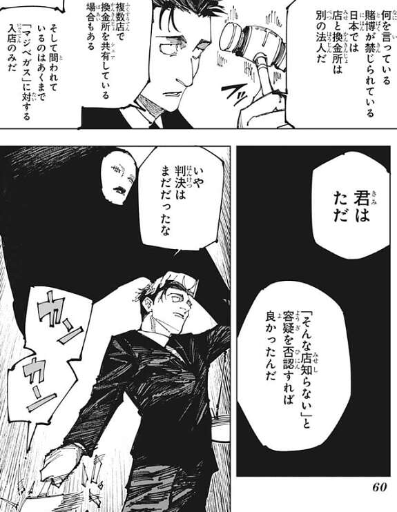 虎杖は頭を抱えながら、どう言い訳しても意味ねーじゃんか、と日車に文句を言います。しかし、日車は賭博が禁じられている日本ではパチンコ店と換金所は別法人で、今回問われているのはあくまで「マジベガス」に対する入店のみだと言い、よって虎杖は「そんな店知らない」と容疑を否認すれば良かった、と教えます。そして、日車は木槌を叩きながら、ジャッジマンに判決を請求します。