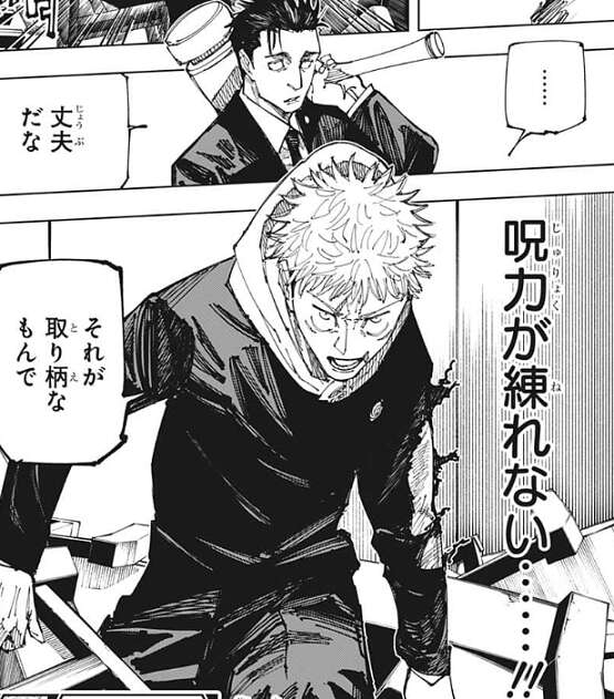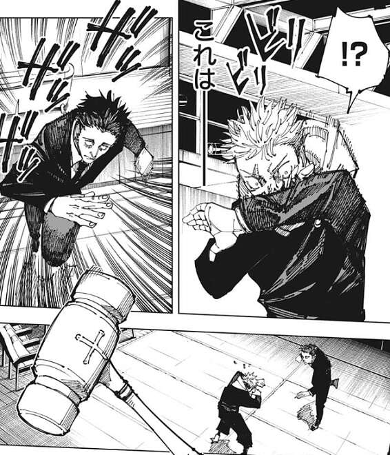 日車はさらに接近してくると、上空の木槌が一旦消え、その後日車の手に戻り、さらに木槌が巨大化します。日車は巨大化した木槌で虎杖を攻撃しますが、虎杖は腕で木槌を受けて、体への直撃を防ぎます。しかし、木槌の攻撃で吹っ飛ばされてしまい、さらに虎杖は呪力が練れなくなっている事に気付きます。