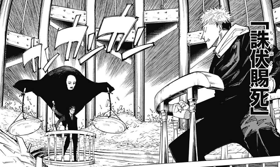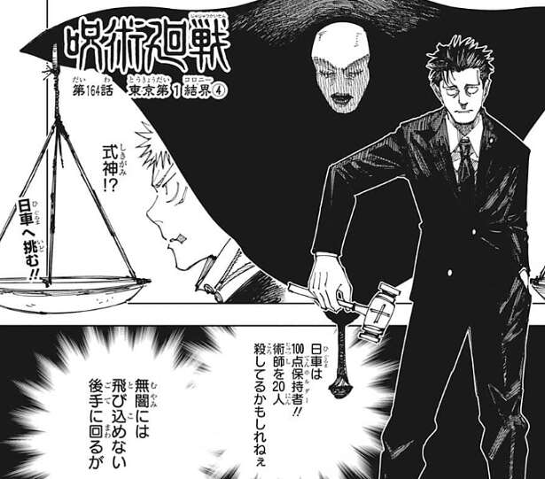 しかし、虎杖の蹴りは空中で突然、止まってしまいます。日車から、ここではあらゆる暴力行為は禁止されている、お互いにな、と言われた後、日車はジャッジマンに始めるように言います。日車の式神がジャッジマンという名前のようで、ジャッジマンは虎杖が2017年7月16日に宮城県仙台市のパチンコ店「マジベガス」に客として入店した疑いがあると、虎杖の過去の行動を読み上げます。虎杖は心当たりがあったようで言葉を濁しますが、ジャッジマンは領域内の者の全てを知っている、と日車が虎杖にジャッジマンの能力を教えます。しかし、ジャッジマンの知っている事は日車には共有されないようで、判決はあくまで虎杖と日車の主張を元に下されるようです。
