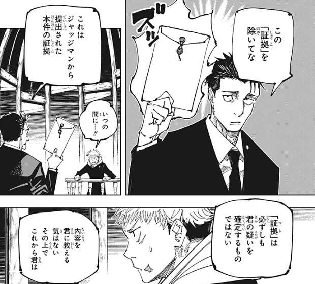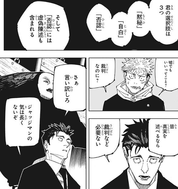 虎杖は有罪になったらどうなるか、日車に質問しますが、その質問に説明責任はないと言い、答えを拒否します。その代わり虎杖の選択肢は「黙秘」、「自白」、「否認(虚偽陳述含む)」の3つがあると日車は教えます。日車から早く言い訳するように促されますが、虎杖は日車が持っている「証拠」の中身を気にします。