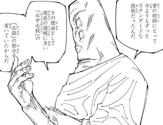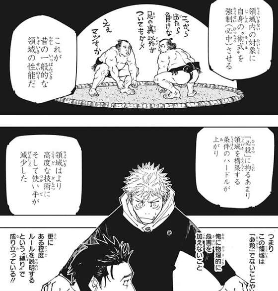 昔の一般的な領域は、領域内の対象に自身の“術式(ルール)”を強制(必中)させるだけでしたが、時代と共に「必殺」にこだわり領域を構築する条件のハードルが上がり、結果高度な技術となって使い手が減っていたそうです。天元の説明を思い出しながら、日車の領域は「必殺」でないことや、物理的に危害を加えないこと、更にある程度ルールを縛りで成り立っている、と虎杖は頭の中で考えます。