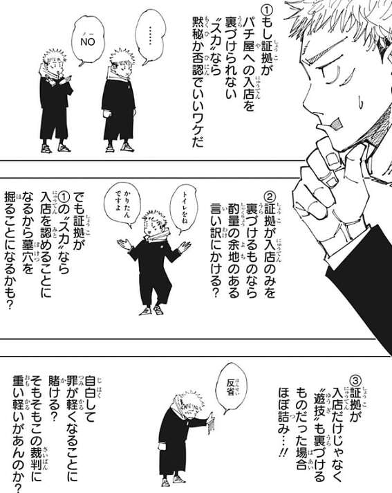 虎杖は実際にパチンコ屋で遊んでしっかり勝っていますが、もし証拠の中身が“スカ”なら黙秘か否認をする、入店のみなら言い訳をする、証拠が遊戯も裏付けるものなら自白して罪が軽くなる事に賭ける、と3通りほどの言い訳を考えます。