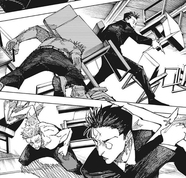 投げつけた椅子が日車の死角となり、虎杖の姿は見えなくなります。その死角を利用して虎杖は移動し、さらに上着も日車に投げつけて日車の虚を突きます。そして、虎杖は自分のTシャツも虎杖に投げて日車の視界を遮ると、日車の足を取りにいきます。