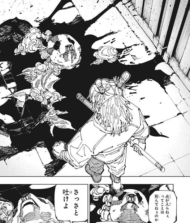 場面は現実へと戻り、前回は稲妻の一撃をくらってパンダは体が引き裂かれたようになっていましたが、場面が戻るとパンダは鹿紫雲一にボロボロにされていました。点が入っていないのでパンダが死んでいないと気付いた鹿紫雲一は、宿儺のことをさっさと吐くように言います。