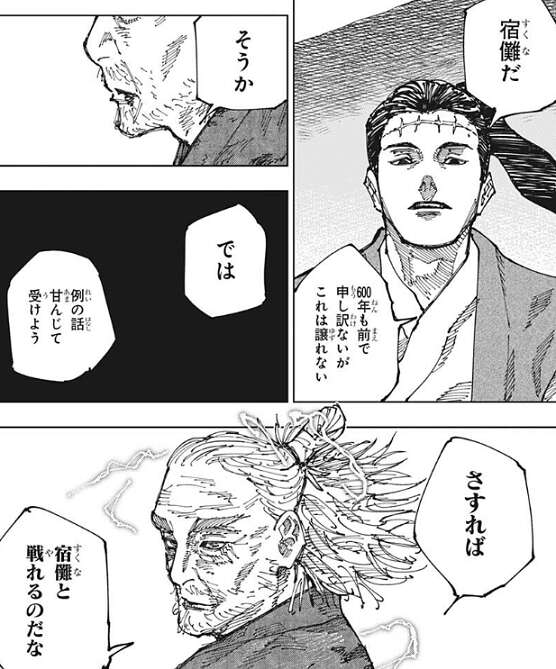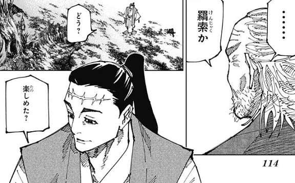 ここで鹿紫雲一の回想が始まります。400年前の鹿紫雲一が侍に話しかけられています。どう?楽しめた?と、話しかけた人物の額には縫い目があるので、この侍は羂索のようです。話しかけられた鹿紫雲一は、やはり貴様と戦るべきだった、と言いますが、この時の羂索は戦闘向きの体ではないようで、勘弁してよ、と答えます。