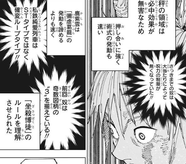 シャルルの時と同様、鹿紫雲一の脳内にも秤の領域と術式のルールが流れます。秤の領域は必中効果が無害なため、押し合いに強く術式の発動も早く、そのスピードは渋谷での真人をも凌ぎます。鹿紫雲一は「彌虚葛籠(いやこつづら)」の発動を諦めるよりも速く、「坐殺博徒」のルールを理解させられます。鹿紫雲一は秤の領域と術式のルールを理解すると同時に、さっきまでの秤は大当たりによって呪力のリミッターが無くなっていた事、領域の状況が前回(シャルルの時)から引き継がれている事なども理解させられます。