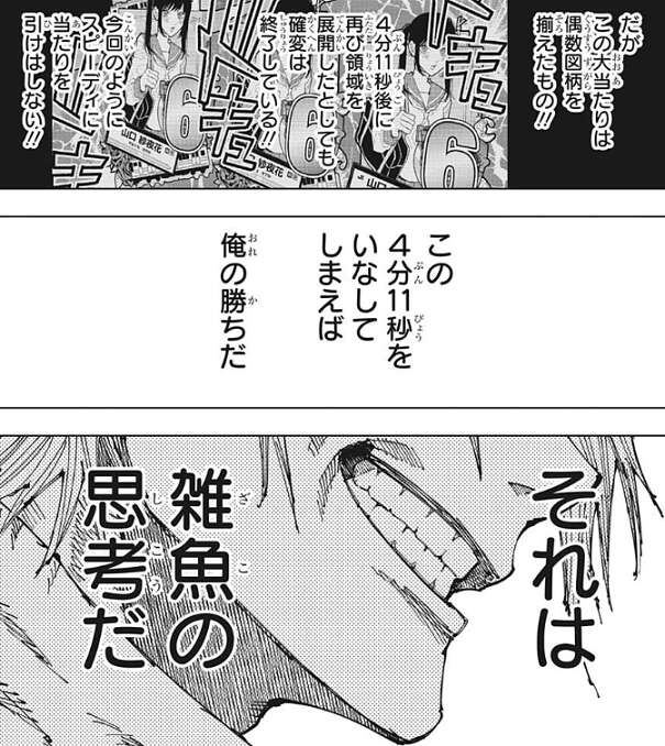 確変に突入した秤に鹿紫雲一は、景気いいじゃねぇの、と話しかけると、俺はな、オマエはどうかな?と、秤は返事をします。鹿紫雲一は秤の領域と術式のルールを理解しているので、秤が今大当たり前で不死身ではないと分かっているので鹿紫雲一は、不死身じゃねぇだろと、秤に指摘します。