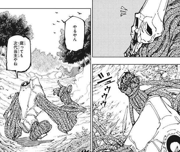 真希は「赤縛」で動けない直哉を呪具の刀で斬ろうとしますが、直哉は体を回転させて呪具の刀を受け流し、さらに加茂憲紀の「赤縛」から逃れます。攻撃をかわされた真希は加茂憲紀に、この呪霊が禪院直哉の成れの果てだと教えます。