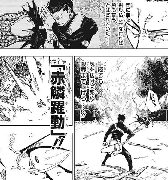 直哉はさらに加茂憲紀を攻撃しようとしますが、加茂憲紀は「赤燐躍動」を使って、直哉の攻撃を見切ろうとします。さらに、そこに真希も割って入り、直哉の攻撃を呪具の刀で受け止めます。