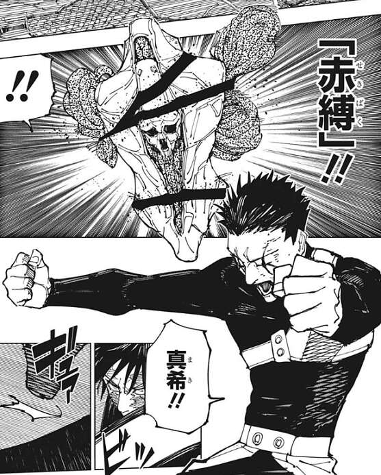さらに真希は加茂憲紀に、コイツは使うぞ 術式、と言い直哉は呪霊でも術式「投射呪法」を使うと、警告します。すると、直哉は投射呪法の触れたものを1秒間固定する能力を応用し、空気を固定しそれを拳で捉えて爆ぜさせる、という技を真希に対して使います。