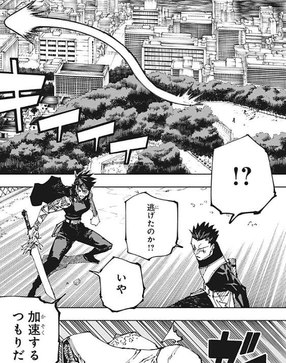 加茂憲紀は、直哉のトップスピードはあまり考えたくないと言い、真希も、幼体で音速超えてたろ、それ以上ってことだ、と直哉の速度を警戒します。真希と加茂憲紀はカウンターを狙う事にし、直哉が真希のところに音速で突っ込んでくるなら、コッチは攻撃置いて待ってりゃいい、と言い、以前直哉を殴ったと同じ様な形で攻撃しようとします。
