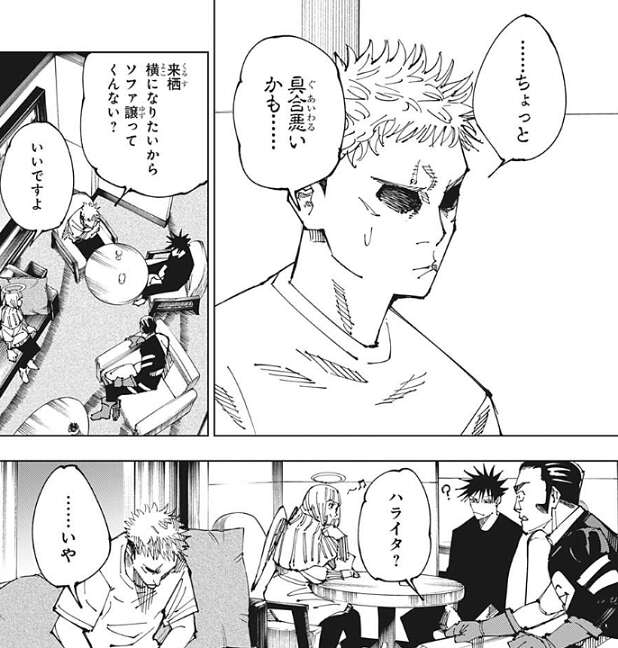 宿儺に“堕天”は俺だ、と教えられた虎杖は驚き、表情の変化は伏黒にも知られてしまいます。伏黒にどうしたと聞かれて、困った虎杖は具合が悪いと嘘をつきます。