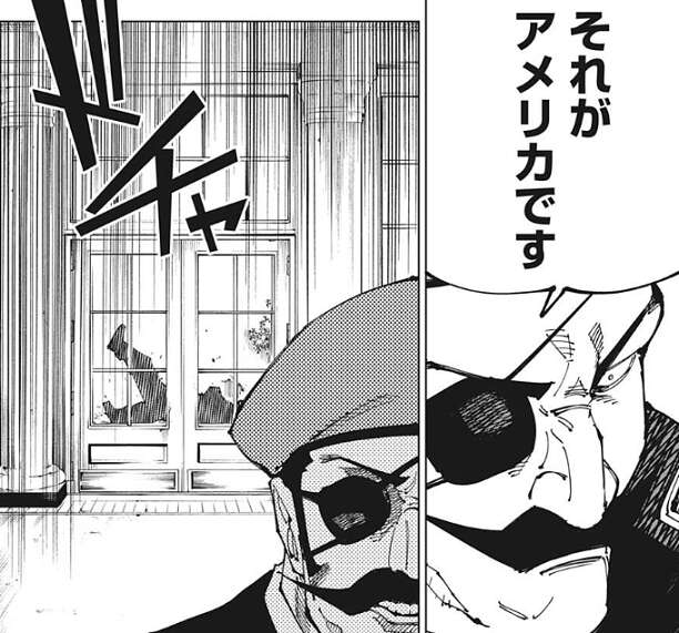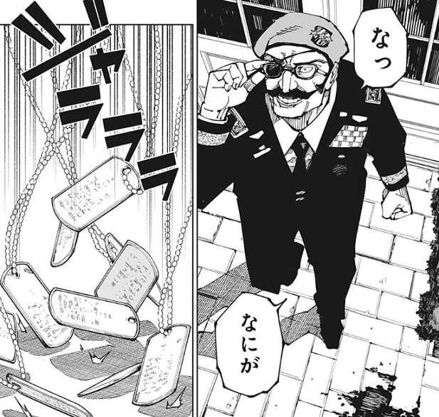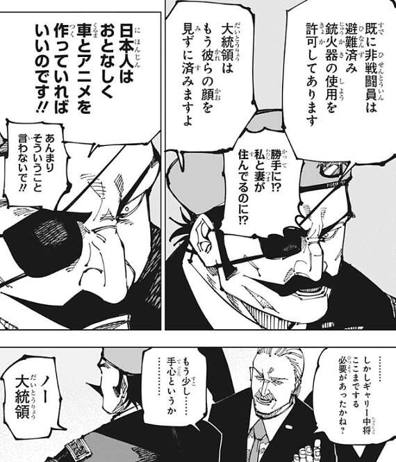 羂索は倒したアメリカ軍人のドッグ・タグをアメリカ大統領達に見せつけると、呪術師狩りの話を詰めましょう、とアメリカ大統領に話しかけます。
