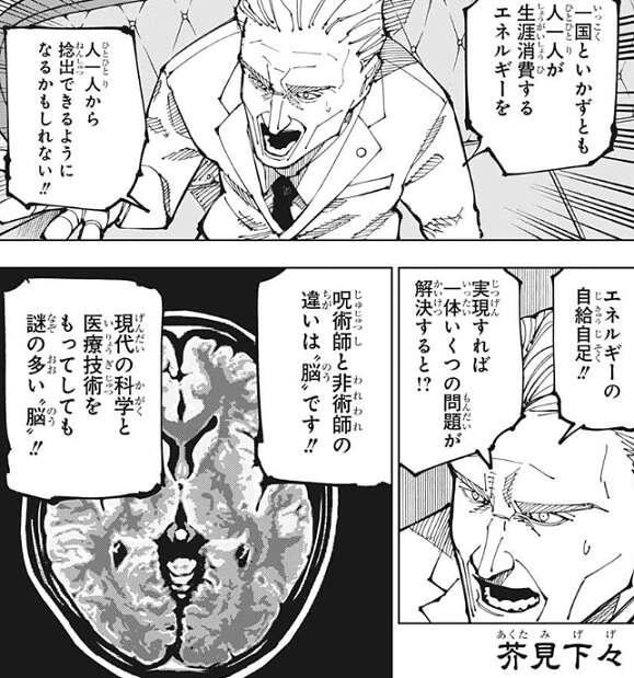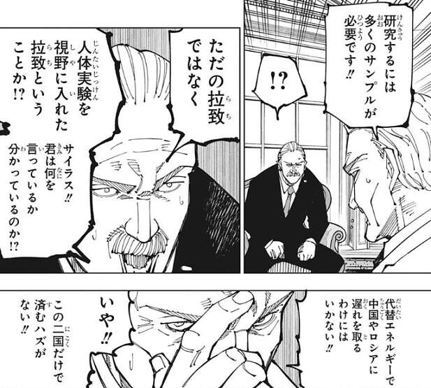 アメリカ大統領は日本国民(呪術師)を拉致するという提案に驚愕し、否定的な態度を見せます。しかし、サイラスはエネルギーの自給自足が実現すればいくつもの問題が解決すると言い、呪術師の脳を研究する必要がある、とアメリカ大統領に説明します。