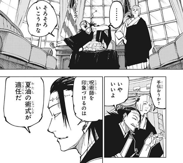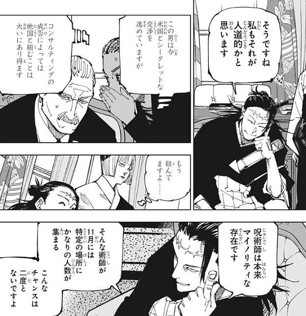 羂索が、本来マイノリティな存在の呪術師が11月には特定の場所にかなりの人数が集まる、と言い、こんなチャンスは二度とないとアメリカ大統領をけしかけます。アメリカ大統領は、羂索の交渉が他国に及んだ場合を想定して、日本人街の警戒の強化を指示し、日系人を守るように側近に言います。