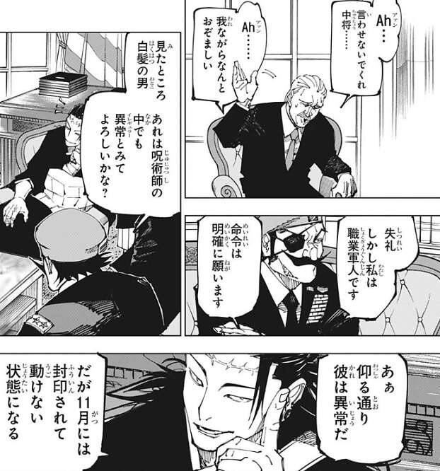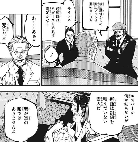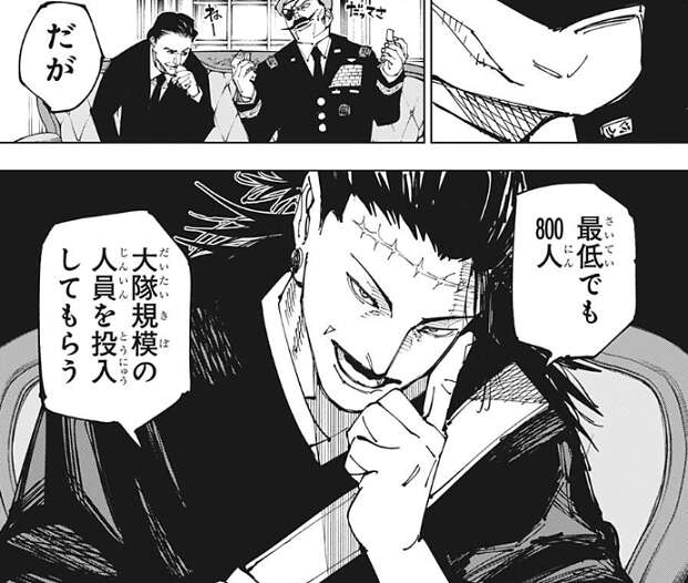 術師同士の戦いでも最後の勝敗を分けるのは肉体の強度だ、と羂索はギャリー中将に概ね同意します。しかし、呪術師の拉致作戦には最低でも800人、大規模の人員を投入してもらう、と羂索は人数を増やすように言うと、ギャリー中将は羂索を馬鹿にして取り合おうとしません。