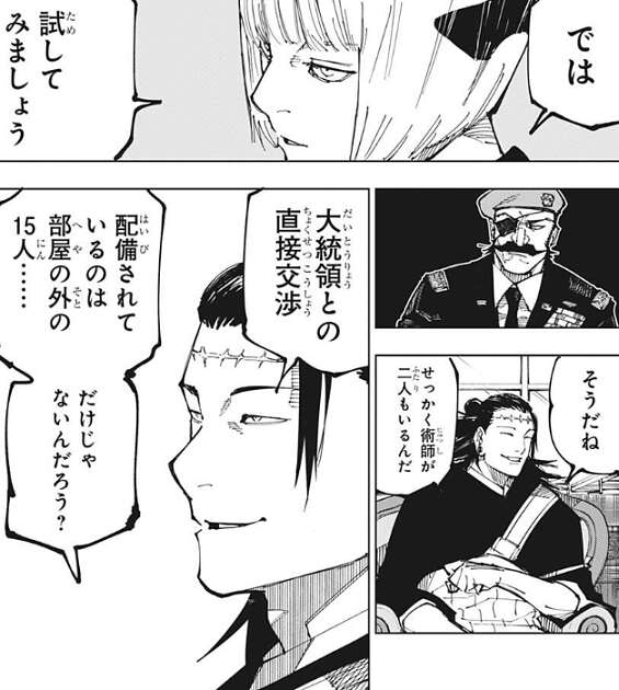前回の記事はこちらです。羂索はアメリカ大統領と直接会談し、日本の呪術師を拉致するように言います。