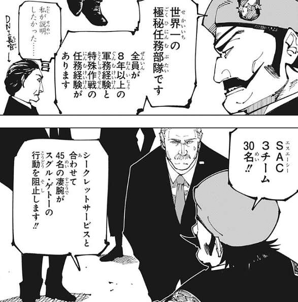 そして、アメリカ大統領は呪術師の拉致作戦を決意し、統合特殊作戦コマンド(JSOC)司令官のギャリー中将に、どれだけの人員を割くべきかアドバイスを求めます。ギャリー中将は羂索に、五条は呪術師の中でもイレギュラーかどうか確認すると、一個中隊もあれば足りる、と断言します。