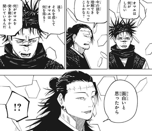 脹相は嬉しそうに話す羂索に、何がしたい、と質問します。何がオマエを突き動かすかと聞いている、と話しかけると、羂索は面白いと思ったから、と答えます。