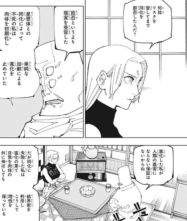九十九は天元に、何故リスクを冒してまで同化を拒否したんだ?と、聞きますが、天元は、拒否と言うより現実を受容した、と答えます。星漿体との同化によって不死の私は肉体を初期化し、単純な加齢による進化を止めていた、と天元は言いますが、九十九はその答えを聞き、怒りを覚えます。結界術を利用して理性を保っている、と言う天元を九十九は非難し、お茶を飲みながら文句を言います。