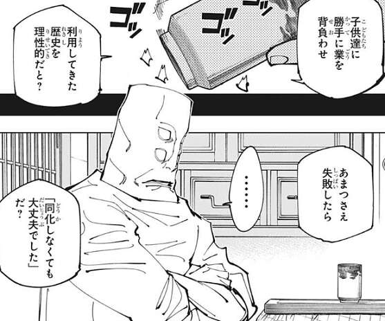 脹相は羂索に興味がないと言い、漠然とオマエに対する殺意が湧いてくる、と言います。羂索は脹相に天元はどこにいる?と、質問しますが、脹相は天元の居場所は答えず、オマエに会いたくないそうだ、と答えます。すると、羂索は、死滅回游は既に役割を終えて、日本にいる非術師の同化前の慣らしは済んでいる、と脹相に教えますが、脹相はその答えを聞き、早すぎると虎杖達の心配をします。