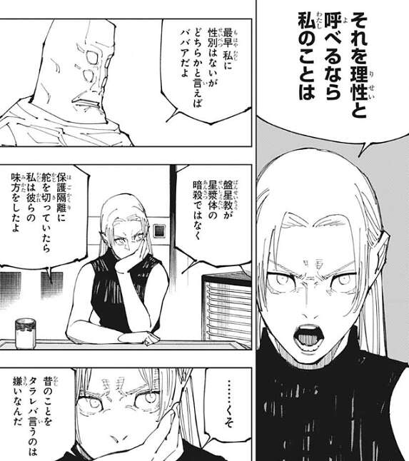 それを理性と呼べるなら私のことは、大聖とでも呼んで崇めろクソジジィと、九十九は展延に怒ります。九十九は、盤星教が星漿体の暗殺でなく、保護隔離に舵を切っていたら私は彼らの見方をした、と言いますが、タラレバ言うのは嫌いなんだ、と吐き捨てます。
