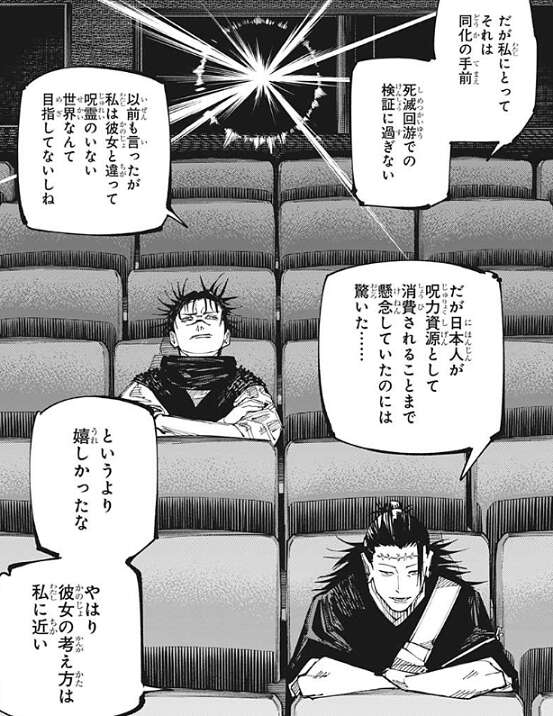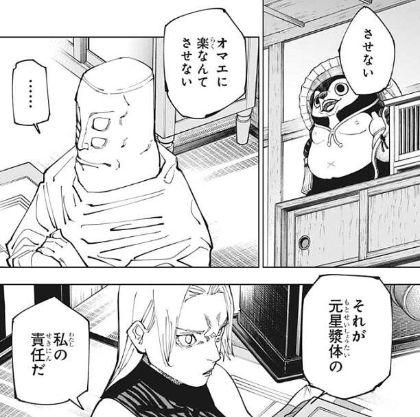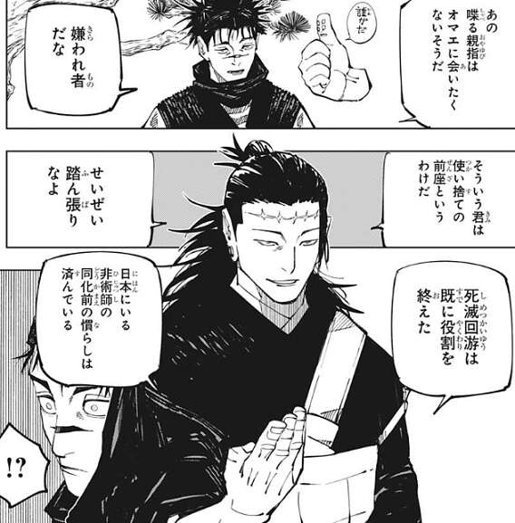 羂索は、見せてあげるよ、終わりの可能性その一つを、と言うと、九十九が以前天元との同化を、「術師に成る」ことだと指摘していた事を話し、それは同化の手前、死滅回游での検証に過ぎない、と言います。しかし、九十九が日本人が呪力資源として消費されることまで懸念していた事を嬉しかったと言い、九十九の考え方は私に近いと脹相に語ります。