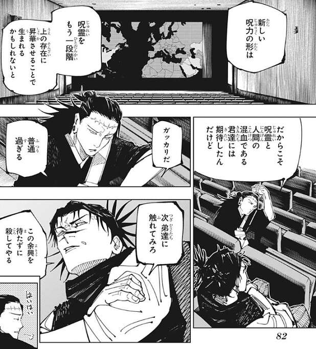 さらに、呪霊の可能性も考えていたと言い、呪霊と人間の混血である脹相達には期待していたん、と言いますが、ガッカリだ、普通過ぎる、と脹相に言いますが、脹相はその話には興味を持たず、次に弟達に触れてみろ、この余興を待たずに殺してやる、と羂索に断言します。