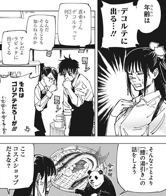 さらに庵歌姫は、年齢はデコルテに出る…!!と、乙骨達に教えますが、乙骨や真希はデコルテを知らず、デコルテをラピュタに出てくるゴリアテと勘違いしてしまい、庵歌姫から、それはゴリアテだろーが!!!と、ツッコまれます。ここでパンダが、そんなことより「鱧の湯引き」の話をしよう、最近みんなで料理に凝っているんだよ、とグルメブールが起こっている事を庵歌姫に説明します。