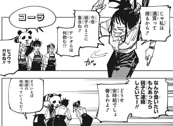 庵歌姫は乙骨達に、家入硝子の家に集合と言うと、ハイテンションのまま酒を買いに行きます。なんか食いたいもんあったら証拠に連絡しといてー!!安月給だから奢るわよ、と庵歌姫は乙骨達に言います。安月給と聞き、乙骨達はコスメショップの店長に自分達の時給を聞きますが、600円だと店長から教えられます。2017年時点での東京都の最低賃金は958円らしいので、乙骨達は自分達の時給がかなり安いと分かり、世知辛いぜぇ、とパンダはつぶやきます。