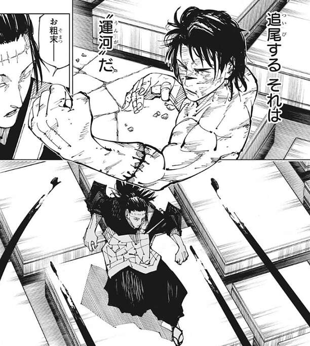 脹相の圧縮した血液が羂索に近づくと、追尾する それは“運河”だ、圧縮した血液をオマエの近くに運ぶための……!!と、脹相はつぶやきます。