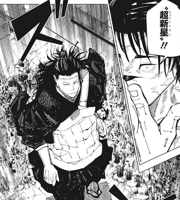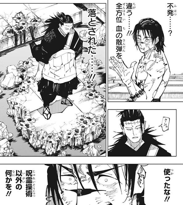 次の瞬間、脹相は超新星を使用し、脹相の圧縮した血液が血の散弾のように飛び散ります。血の散弾が羂索に当たったかに見えましたが…。