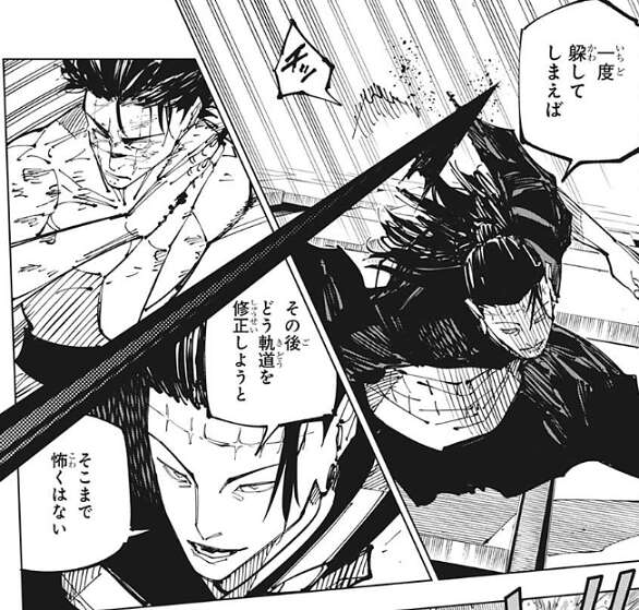 追尾するような穿血の軌道を見て羂索は、これは壊相の……、と心の中でつぶやきます。改めて脹相を見ると、脹相は壊相の「翅王」を使用しながら、羂索に近づいていました。