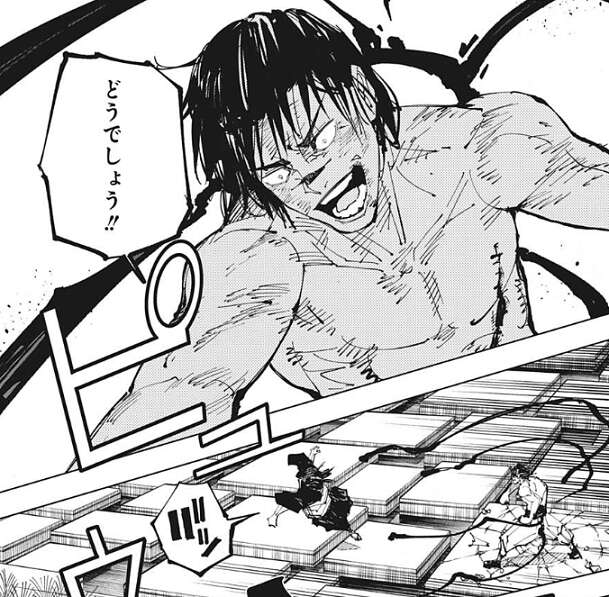 “追尾”を付与した所で「穿血」ほどの速度のない技、と羂索は言い、脹相の翅王での攻撃を意味がないと言わんばかりの口調で、羂索は脹相を見下します。しかし、壊相のように……優雅にっ、血塗のように!!自由に!!!と、脹相はつぶやくと、腕を自分で羂索の方に飛ばします。